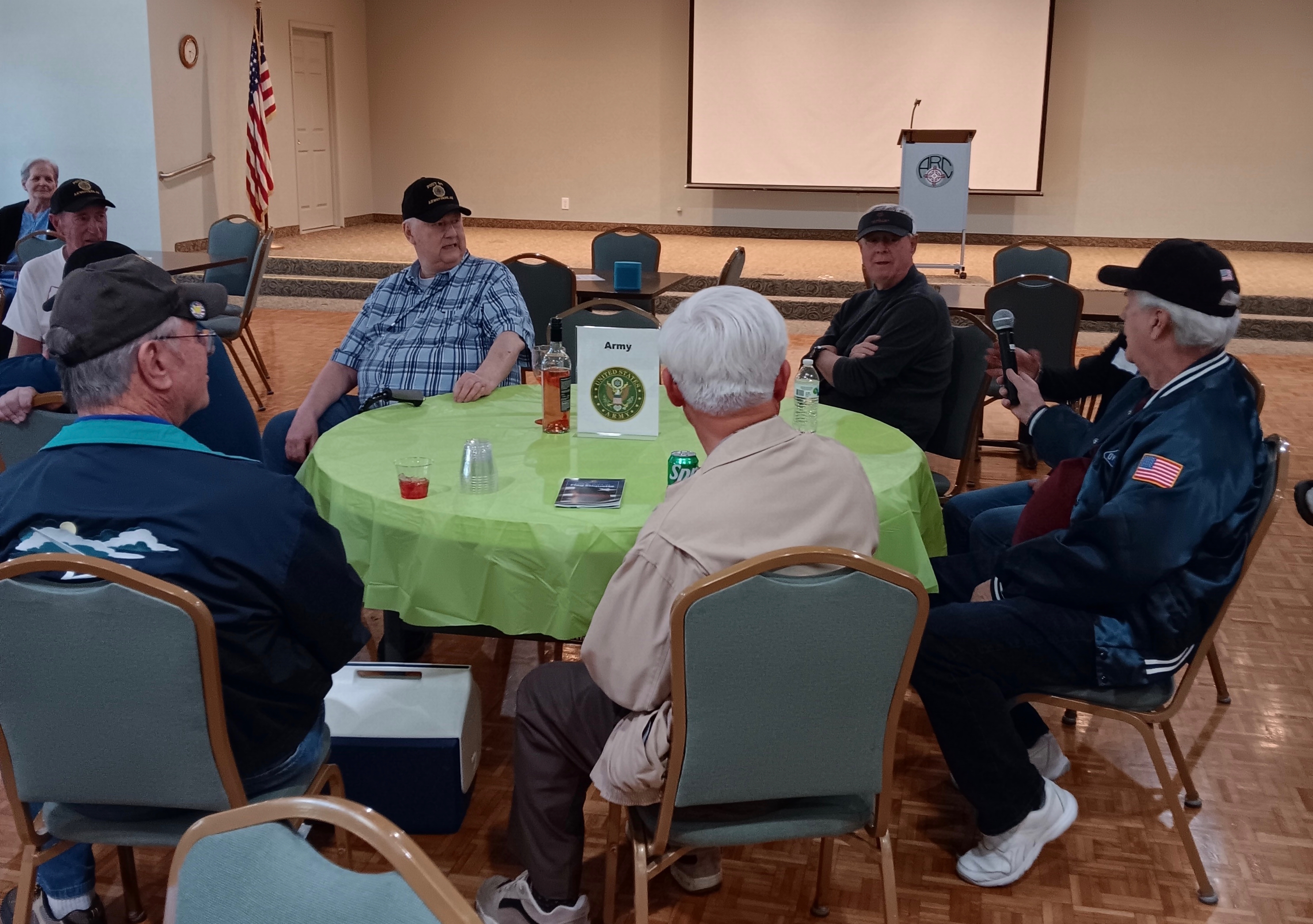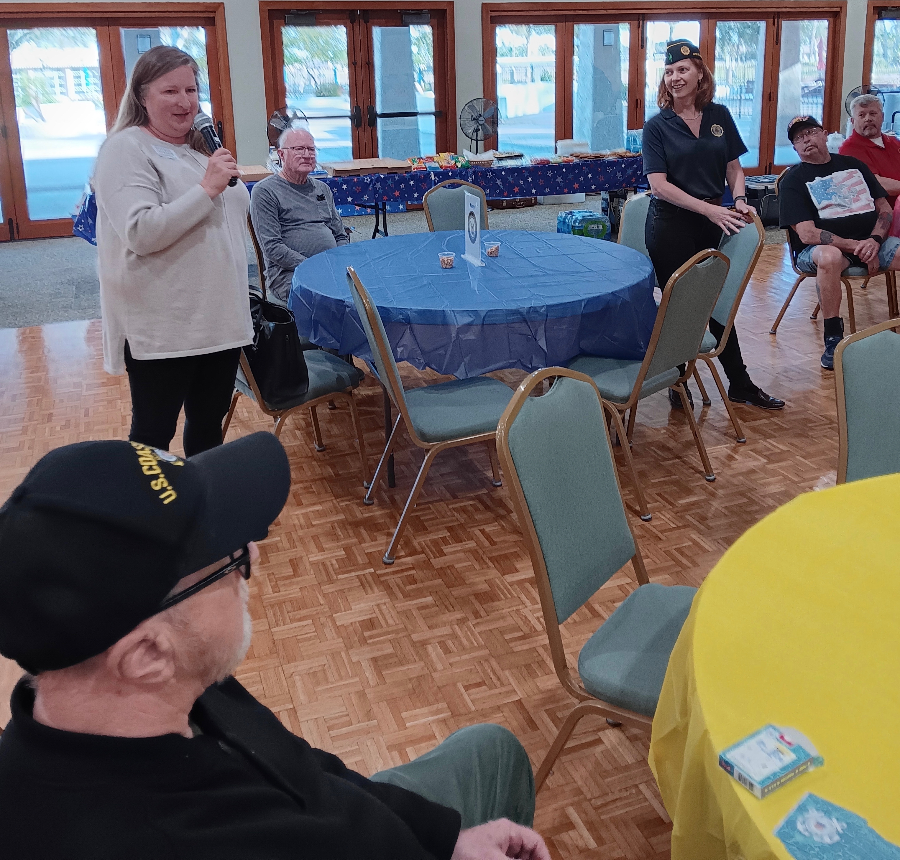 The Emcee of the event, Brenda Smull, went around the room with a microphone so that the veterans could introduce themselves and share where and when they served their country. The dates ranged from 1962 to the early 2000s. All branches of the military were represented with the Air Force table having the most people. John Augustyn was our sole Coast Guard veteran and he enthusiastically shared light blue playing cards with the crest of his branch.