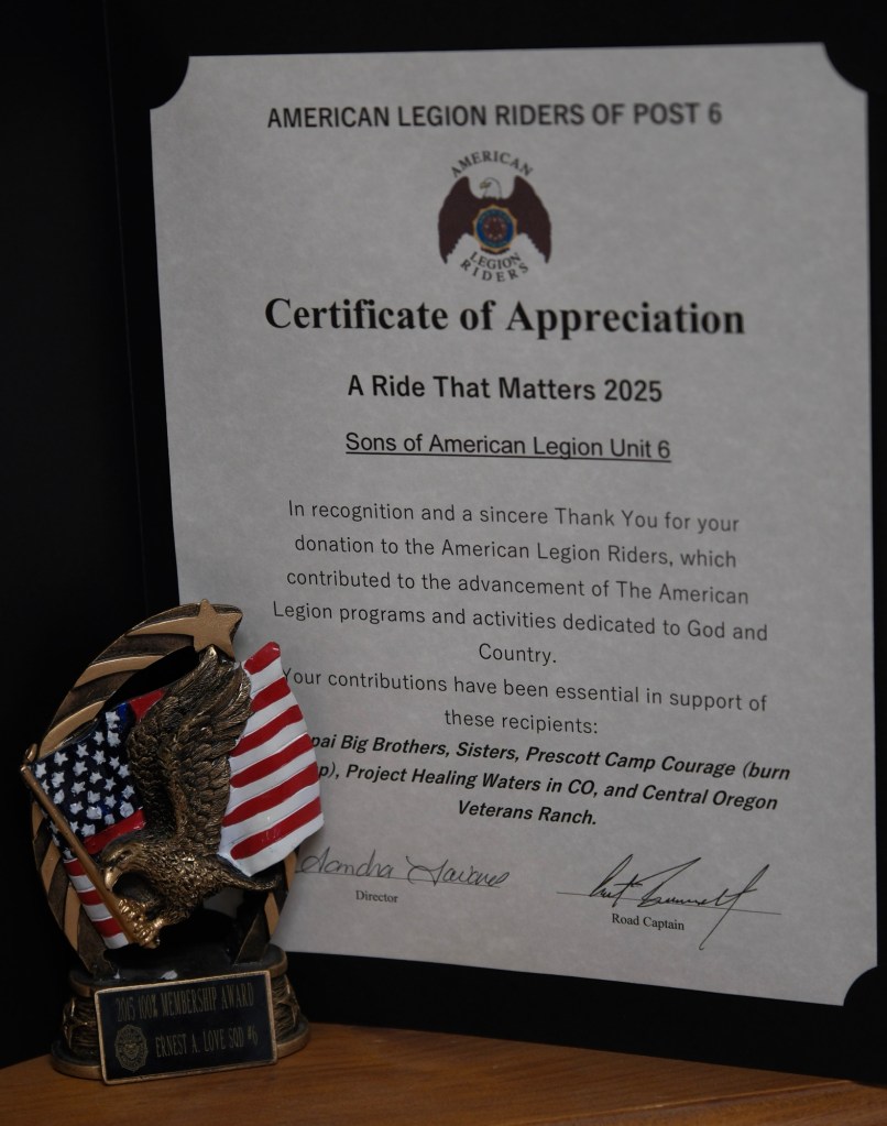 In addition to visiting the non-profits, the ALR team stopped at over 10 American Legion Posts along the route of A Ride that Matters. At the June 2025 General Meeting of Legion Post 6 in Prescott, Commander Sam McPherson gave praise and recognition for the outstanding hospitality to five Legion posts who went above and beyond to support and welcome the tired and weary riders.