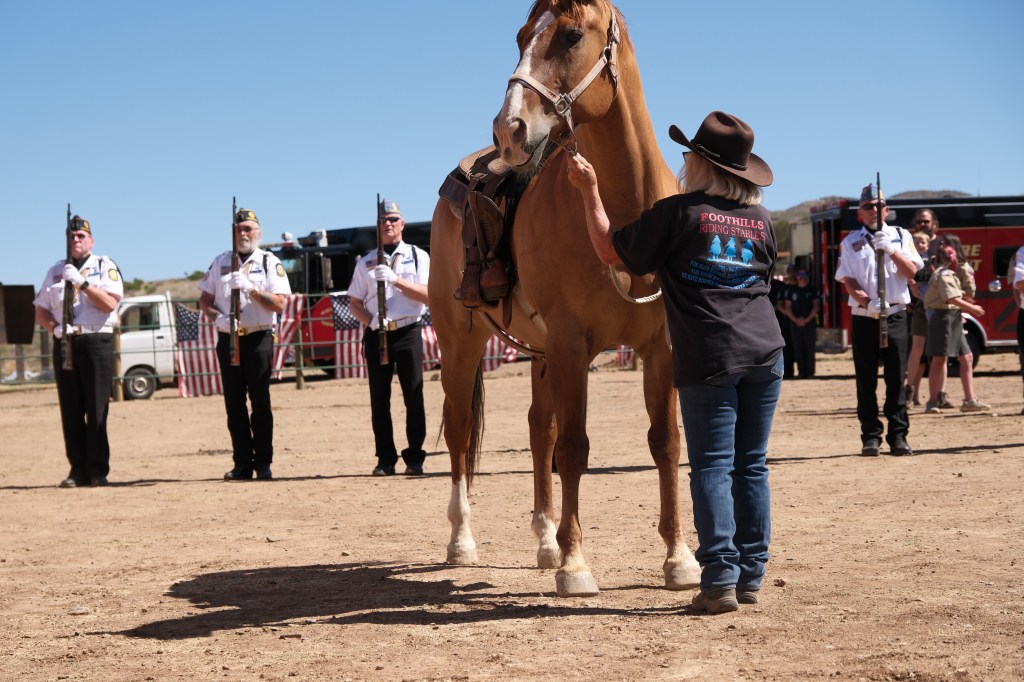 Seeing a beautiful horse named Cash being led out by Phyllis was a touching Missing Rider Tribute to Mark Merdith who passed away six months prior. Wes gave a heartfelt announcement to those gathered that morning for the ceremony about his friend who was a driving force for the special Flag Day event and asked for a moment of silence. It was a moving and powerful moment I will never forget.
