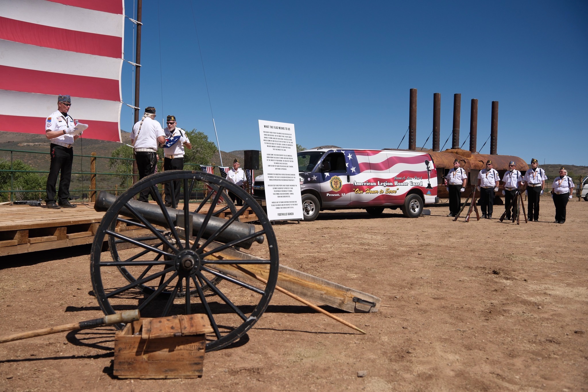 A poignant flag retirement ceremony was held thanks to the dedication and hard work of Foothills Ranch owners Wes and Phyllis Holmes. Numerous organizations also contributed to the effort by volunteering and donations, including local Boy Scout Troops, American Legion Posts and family chapters from Prescott, Cottonwood, Chino Valley, and Humboldt, the Ernest A. Love Post 6 Honor Guard, American Legion Riders and local businesses (see below for more details on that part of the story).