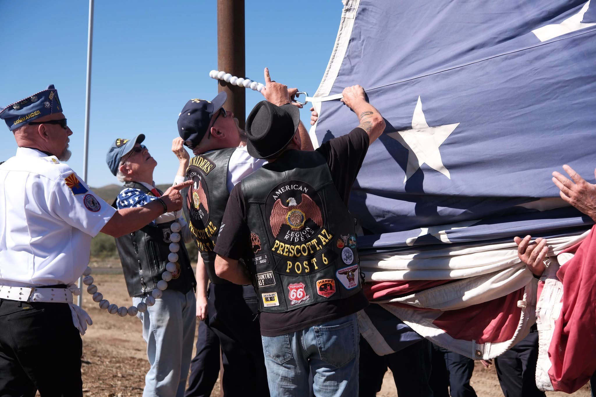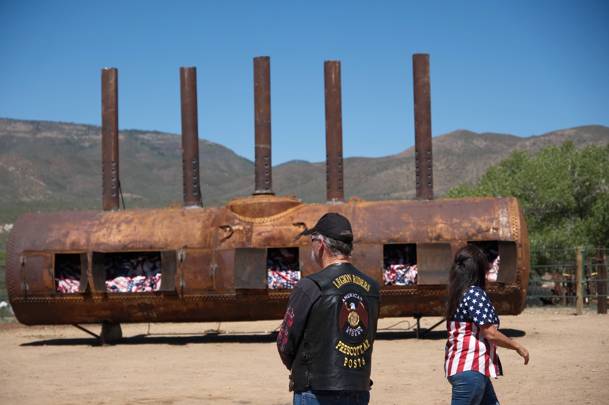 Two weeks prior to the event on 6/14/25, Wes made a call to the Director of the Post 6 American Legion Riders (ALR) stating that if they didn’t get the funds to purchase the oil tanker then the Flag Retirement ceremony would need to be cancelled. That is when Sandra Tavares, ALR Director in Prescott sprang into action and worked with the Commander and other family chapters of the Ernest A. Love Legion post to pull together the donations needed for Wes to acquire the oil tanker he found on Facebook Market place. Now he had to drive his truck and trailer to over 375 miles to St George, Utah to pick the 13,000 lb steel metal tank. It was a harrowing trip back as the length and weight of the tank upset the balance of the trailer.