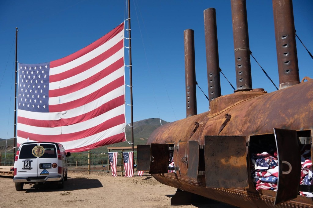 The other striking and impressive element of Flag Day 2025 was the large, rusty brown incinerator with its five 9ft chimney stove pipes. Prior to the flag retirement ceremony, the five hand-welded doors of the converted oil tanker were flung open to reveal over 3,000 flags stacked high.