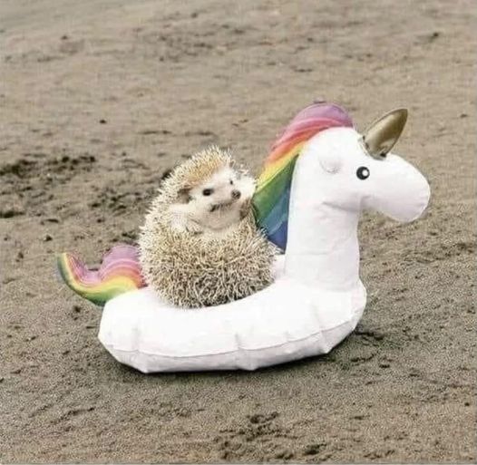 9. Ernie has hydrophobia, so he rides his inflatable unicorn in the sand.